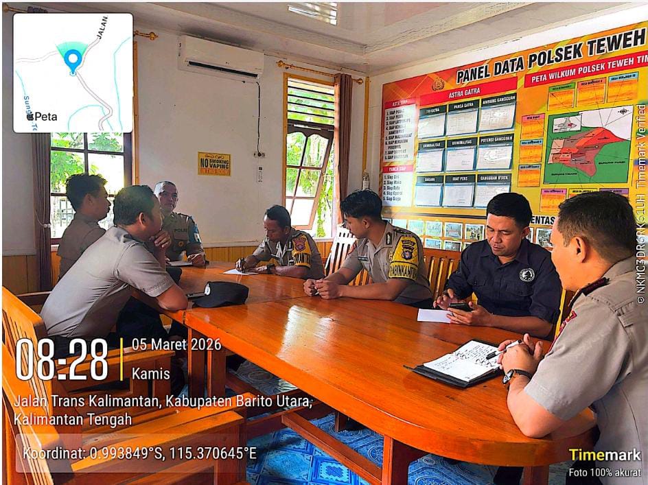 Barito Utara – Kapolsek Teweh Timur, IPTU Ade Soemarna, S.Sos., M.A.P memimpin kegiatan apel pagi sekaligus analisa dan evaluasi (anev) di halaman Mako Polsek Teweh Timur, Kamis (5/3/2026) sekitar pukul 08.00 WIB.