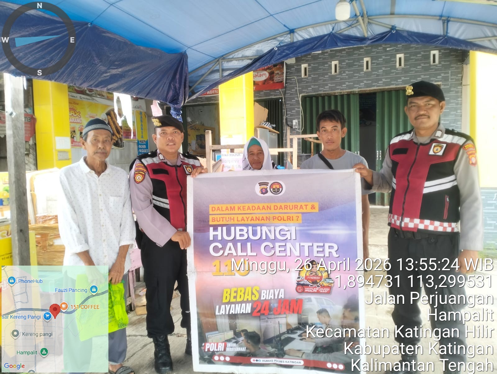 Samapta Polres Katingan melaksanakan kegiatan sosialisasi layanan Call Center 110 Polri kepada masyarakat Desa Hampalit, Kecamatan Katingan Hilir, Kabupaten Katingan, Minggu (26/4/2026). Siang.