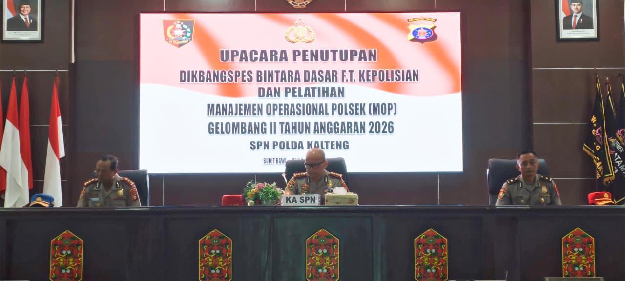 SPN-Pulang Pisau,kecamatan bukit rawi,Provinsi Kalimantan Tengah – (Senin 27 April 2026) , Bertempat aula devia cita pelaksanaan Upacara Penutupan Dikbangspes Gel. II dan Manajemen Operasional Polsek (MOP) T.A 2026 dipimpin langsung oleh Ka SPN Polda Kalteng KOMBES POL DHARMESHWARA HADI KUNCORO, S.I.K.dan dihadiri oleh PJU, Katim Pengampu Mata Pelajaran, dan seluruh pengasuh serta Serdik.